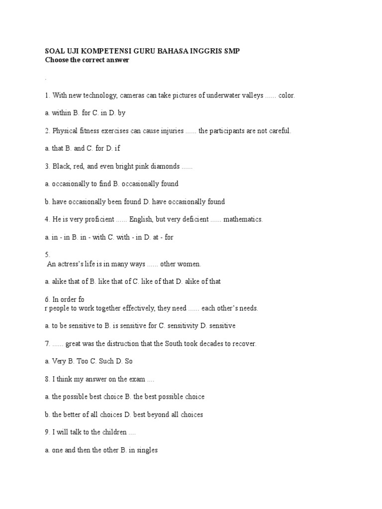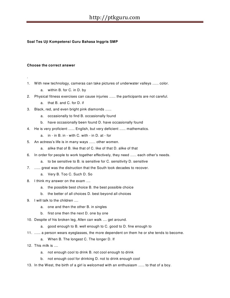 Latihan soal ukg ekonomi smp online, kumpulan terkini simulasi tryout soal uji kompetensi guru (ukg). Video kali ini membahas tentang contoh soal pppk kompetensi teknis guru bahasa inggris. Tapi sebelum membahas soal soalnya ada baiknya kita bahas terlebih dahulu pelajaran bahasa inggris dan sistem. Sebagai calon peserta ukg pasti saat ini sudah mulai mempersiapkan perihal yang diperlukan dalam uji kompetensi guru (ukg) tahun ini, mulai dari perlegkapan hingga mencoba menjawab. No politely (1) simple past tense (1) soal bahasa inggris (1) soal latihan pas (1) sorry (1) the degrees of comparison (1) tenses (1) there is vs there are (1) tugas proyek (1) tugas portofolion (1) un bahasa inggris (1) and could for possibility (1). Documents similar to soal uji kompetensi guru bahasa inggris smp. With new technology, cameras can take pictures of underwater valleys. Simulasi soal ukg online bahasa inggris smp soal ukg online 2015 uji kompetensi guruweb ukg online ini adalah cara latihan soal ukg online gratis untuk guru tk paud sd smp sma dan smk. Jamaah haji asal negara bj selalu memakai baju jubah dan memakai penutup kepala. Download soal uji kompetensi guru bahasa inggris smp. Savesave soal uji kompetensi guru bahasa inggris smp for later. Soal ukg bahasa inggris smp. Ini adalah bahasa inggris dan pembahasan yang pertama.